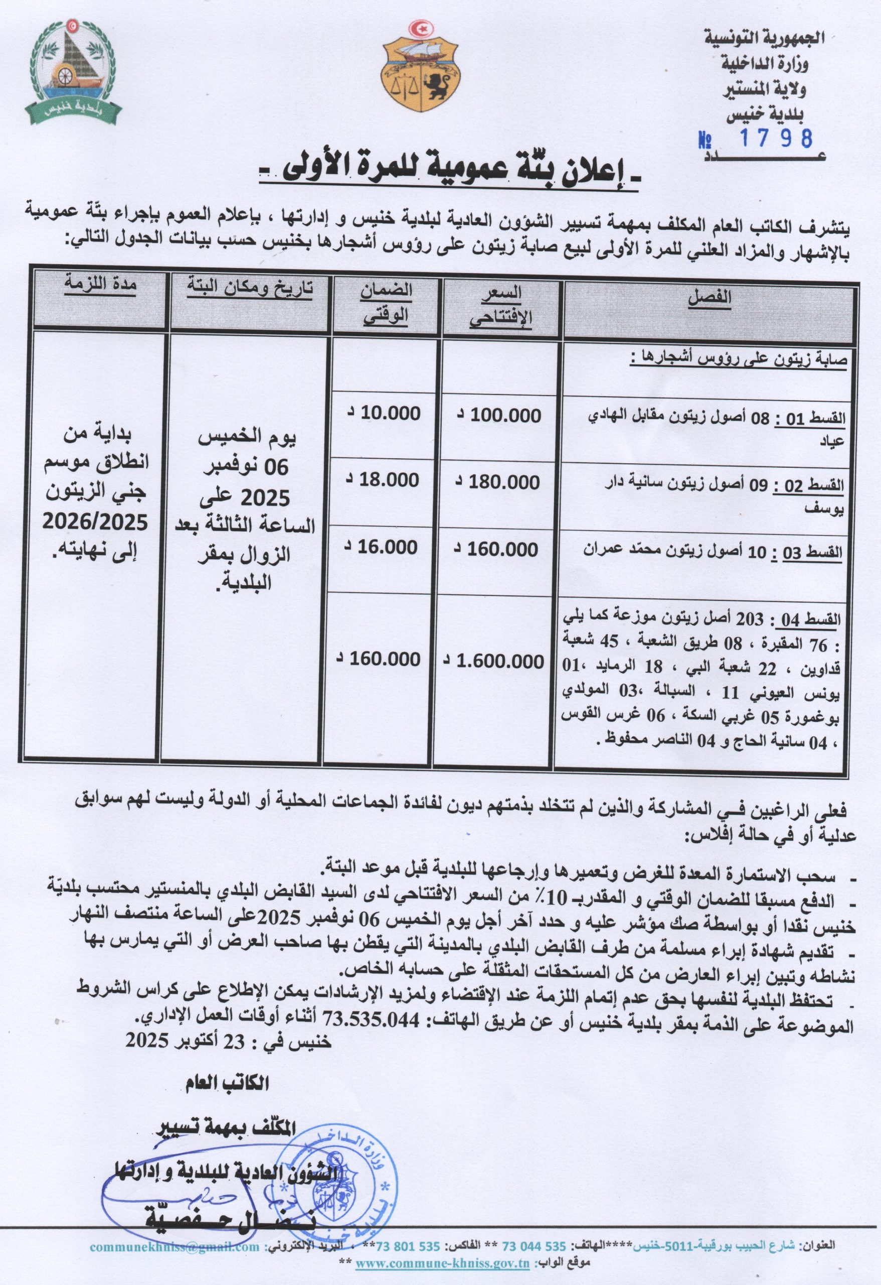 اعلان بتة عمومية للمرة الاولى لصابة الزيتون على رؤوس أشجارها انواع وثائق اخرى: الملحق مفقود تاريخ: 2025/10/23 اعلان بتة عمومية للمرة الاولى لصابة الزيتون على رؤوس أشجارها