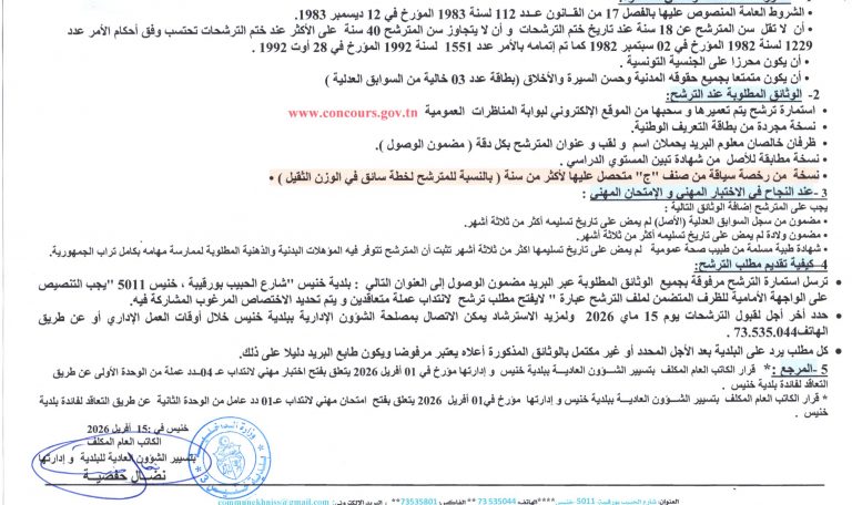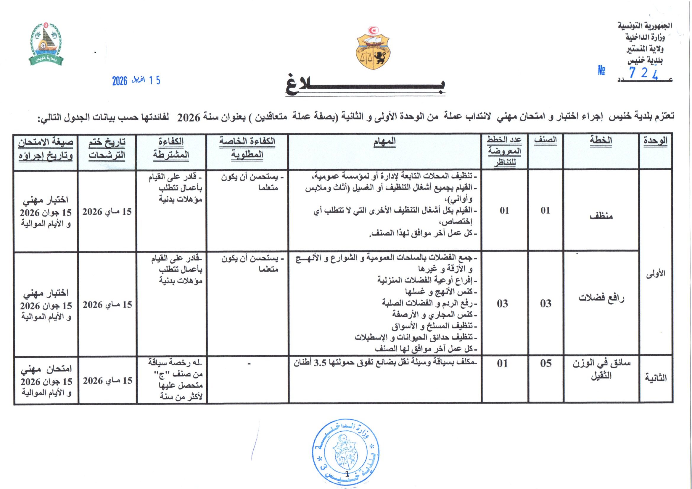 بلاغ اجارء اختبار و امتحان مهني لانتداب عملة من الوحدة الاولى و الثانية ب