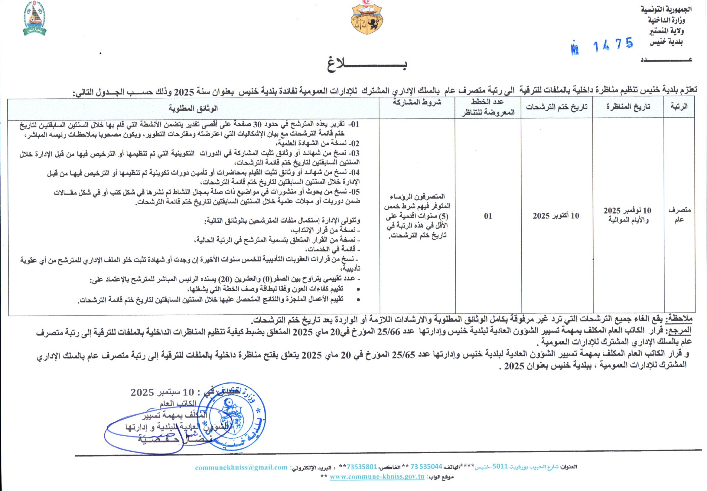 بلاغ مناظرة داخلية بالملفات للترقية الى رتبة متصرف عام بالسلك الاداري المشترك للادارة العمومية لفائدة بلدية خنيس بعنوان سنة 2025