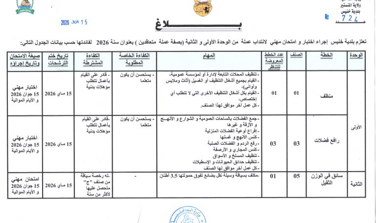 بلاغ اجارء اختبار و امتحان مهني لانتداب عملة من الوحدة الاولى و الثانية ب صفة عملة متعاقدين بعنوان سنة 2026