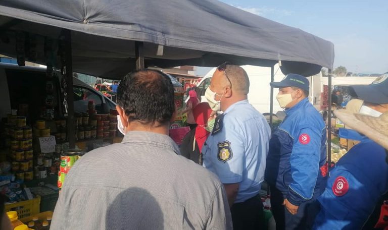 اليوم الأحد 08 نوفمبر 2020 حملة مراقبة و متابعة لمدى التزام و تطبيق البروتوكول الصحي للتوقي من فيروس كوفيد 19+ بالسوق الاسبوعي بمدينة خنيس من