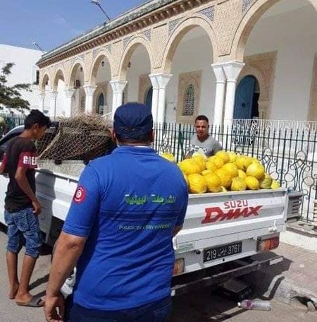 حملة تنظيم انتصاب الباعة و الباعة العرضيين برحبة خنيس و الطرقات الرئيسية قام بها اليوم الجمعة 02 جويلية 2021جهاز الشرطة البيئية .
