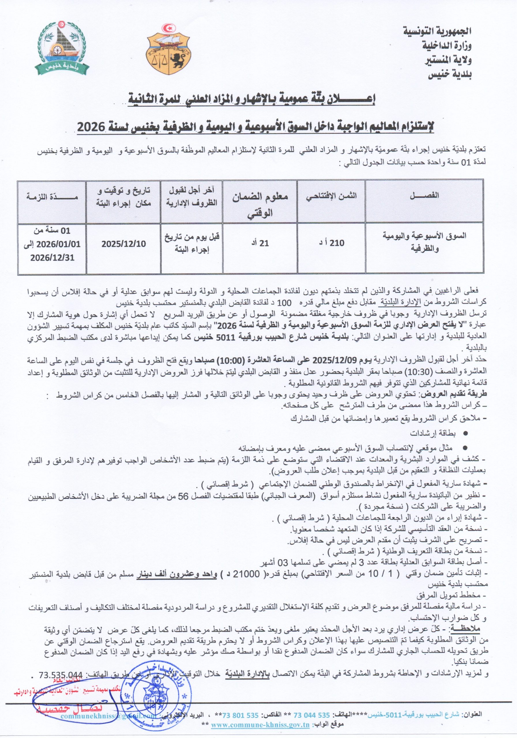 اعلان بتة عمومية بالاشهار و المزاد العلني لإستلزام السوق اليومية و الظرفية بخنيس لسنة 2026
